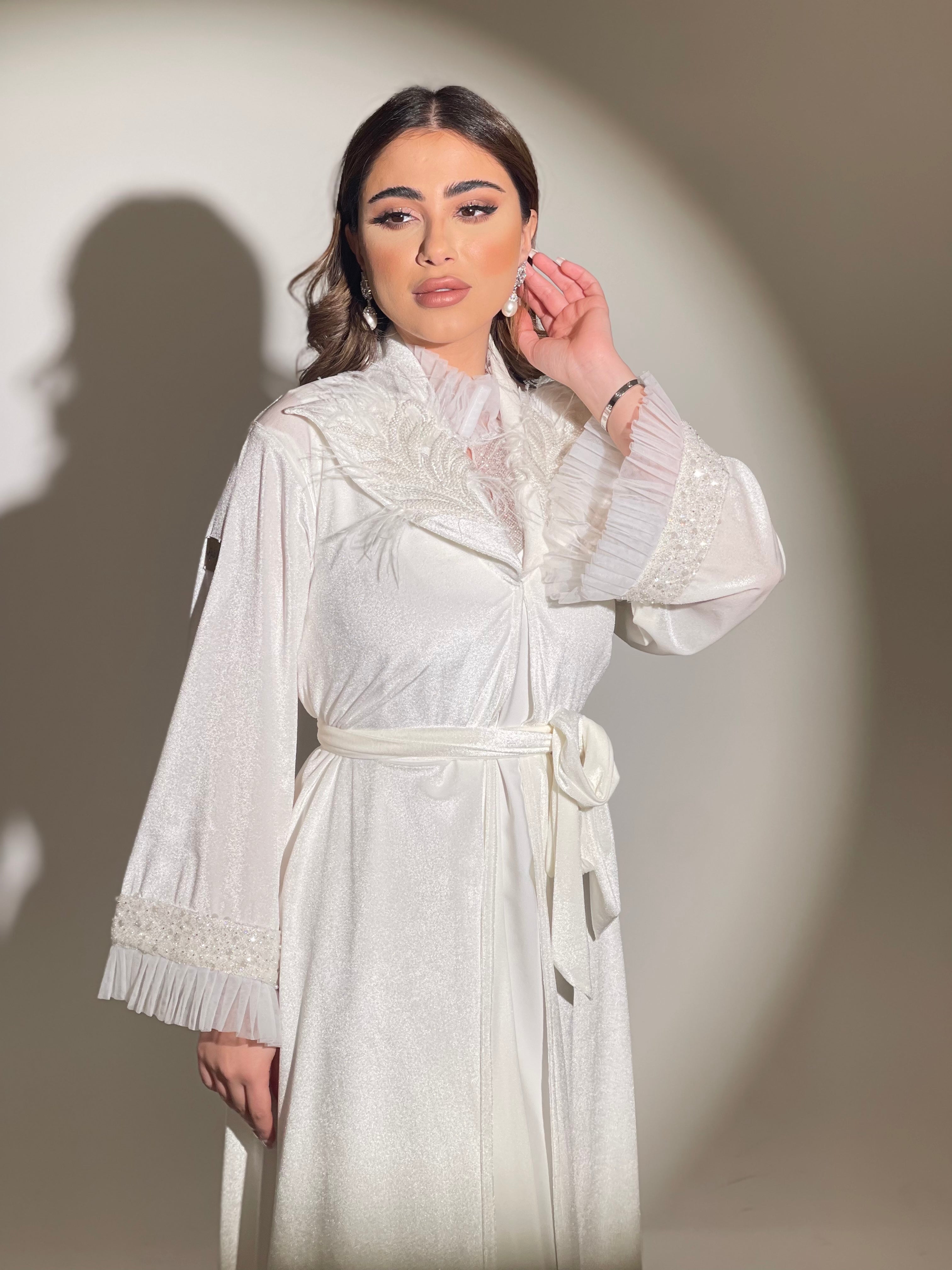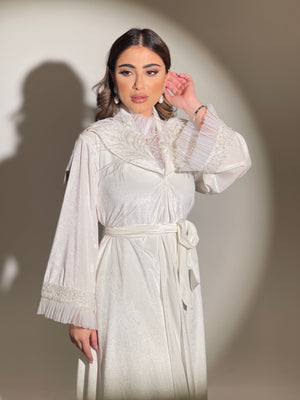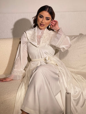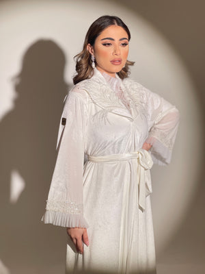 روب استقبال عبارة عن قطعتين الروب مخمل حرير باللون الاوف وايت مزين بالشك،القطعة الداخلية عبارة عن نفنوف حفر كريب