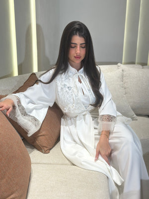 روب استقبال عبارة عن قطعتين الداخليه درس كريب الروب خامته حرير مزين بالخام المشكوك والتور المشكوك