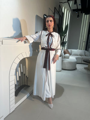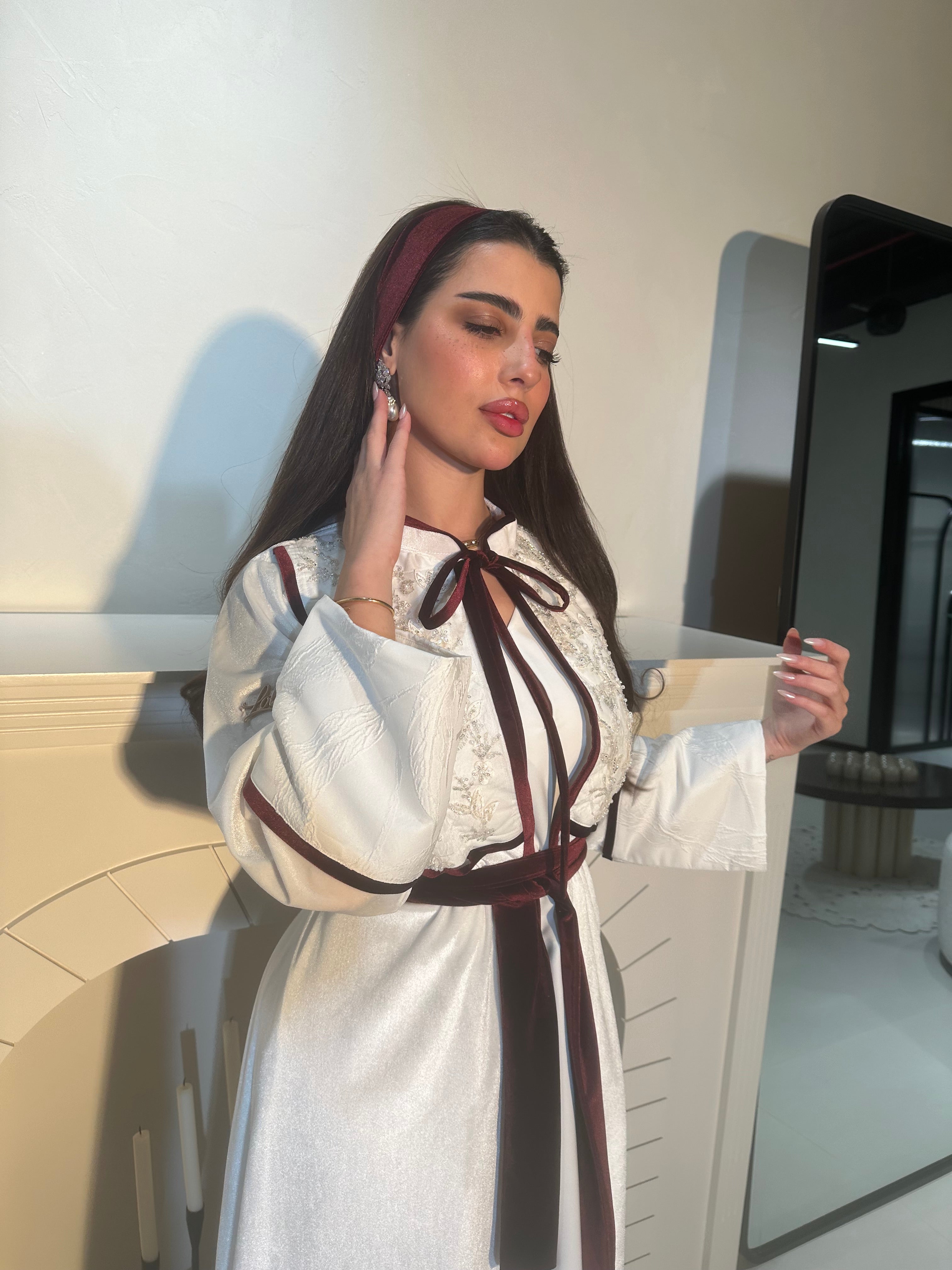 روب شتوي قطعتين الداخليه درس حفر كريب الروب مخمل حرير باللون الاوف وايت مزين بالشرايط باللون البرقاندي والشك يوصلج مع الحزام وربطة الشعر
