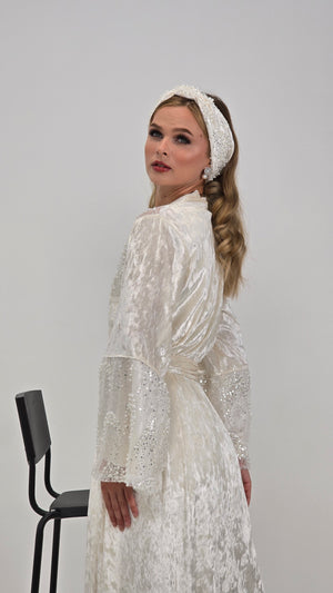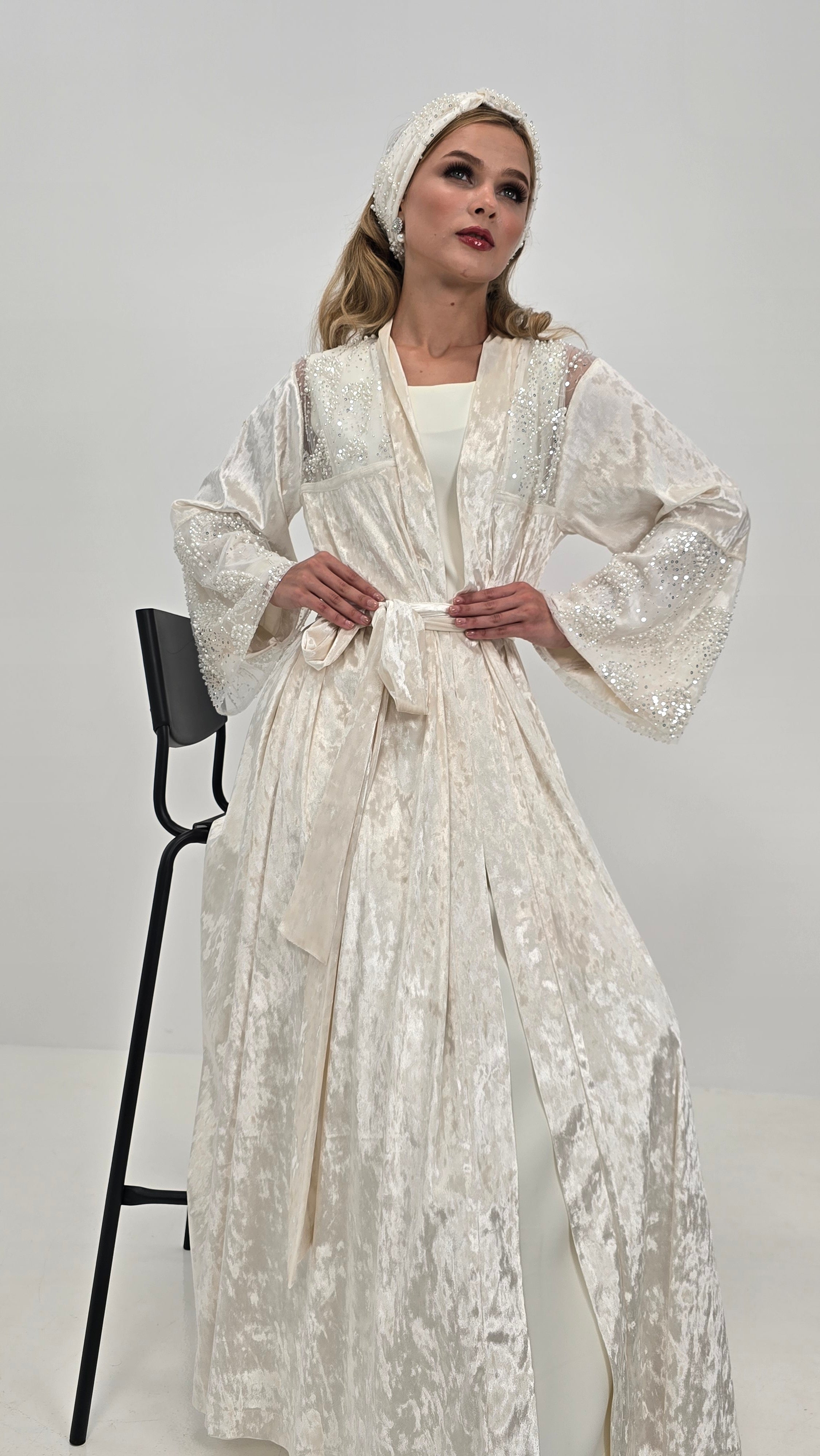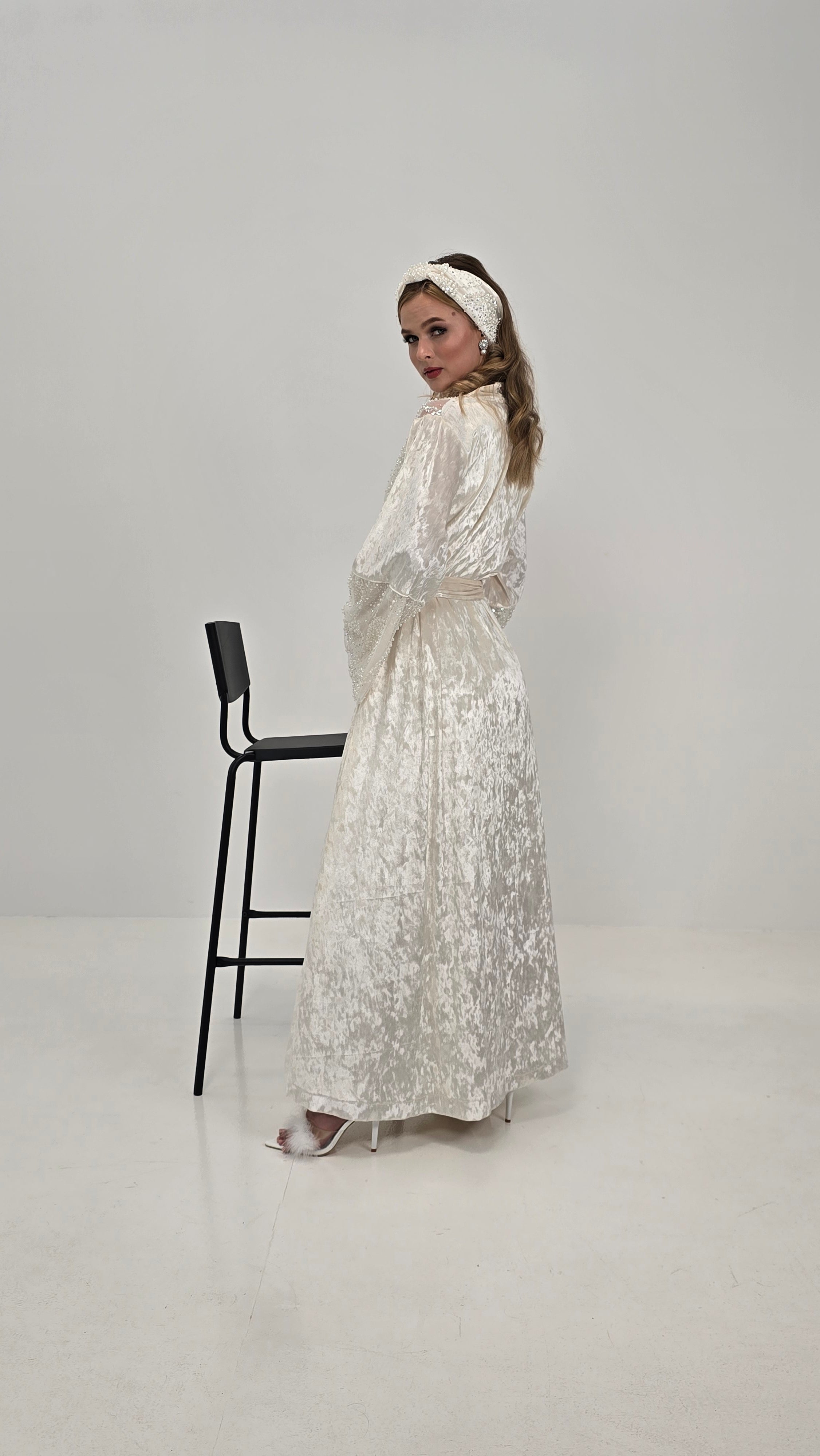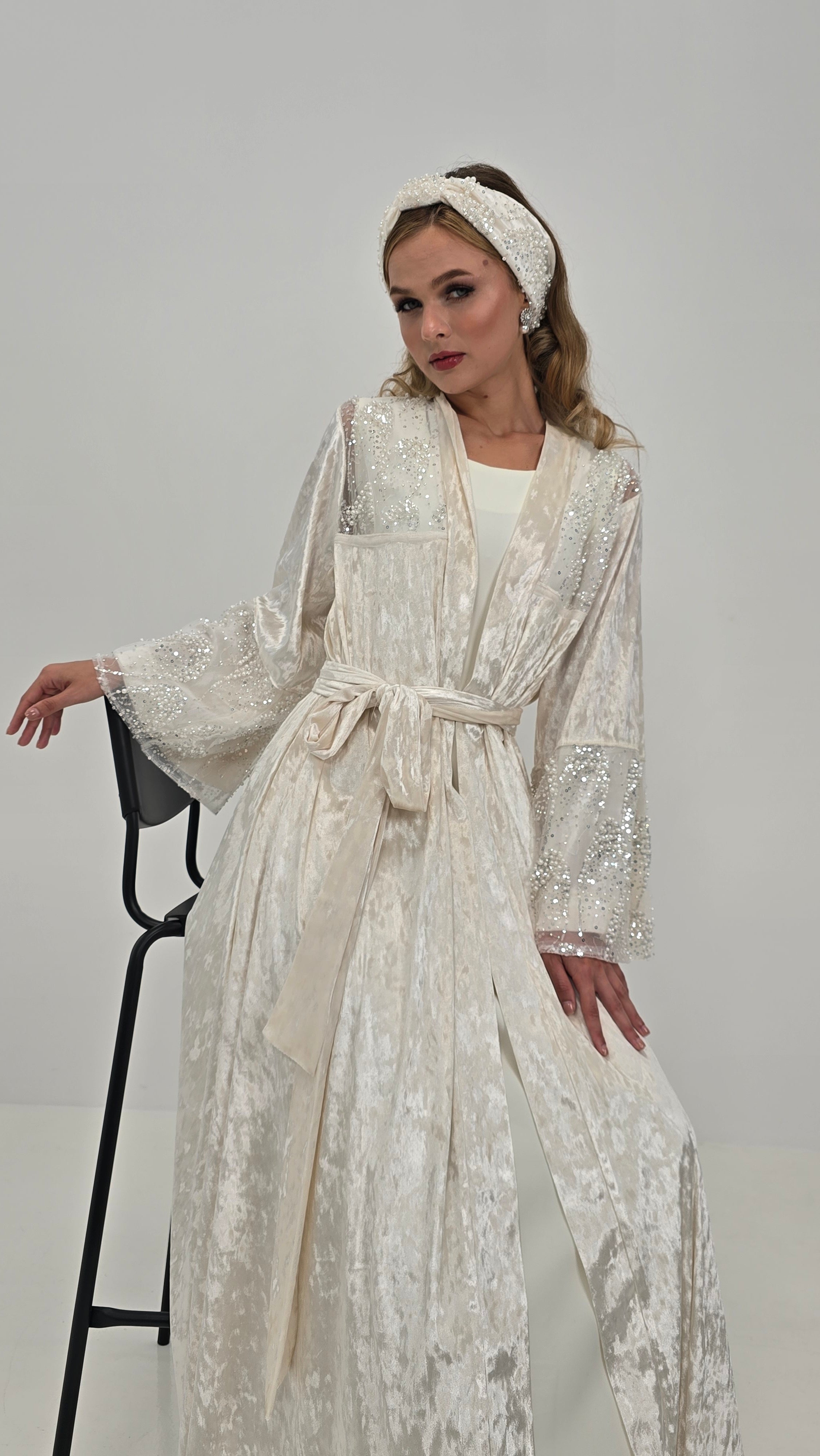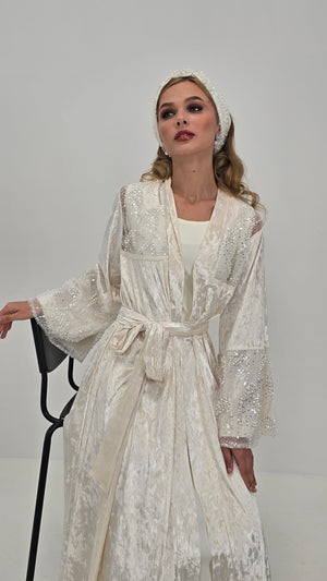 قطعتين روب مخمل معفس باللون الولؤي  مزين بالشك  والداخليةنفنوف حفر كريب مع الهيد بيس مزين بالولو والحزام