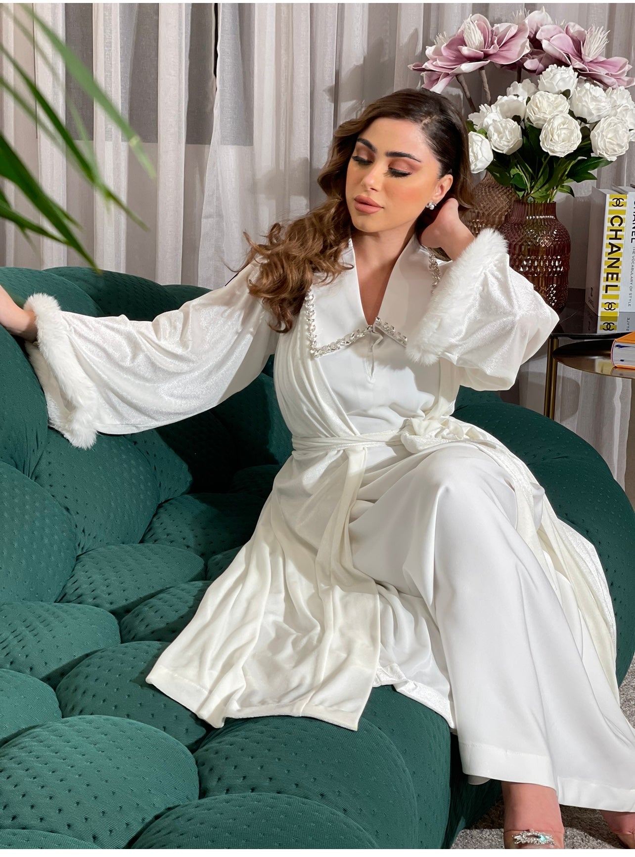 روب قطعتين الداخلية حفر كريب الروب مخمل حرير اوف وايت مزين بالفروو