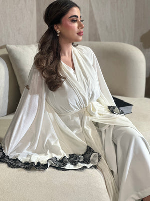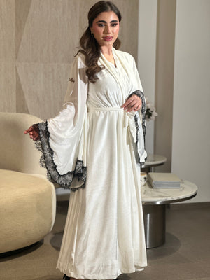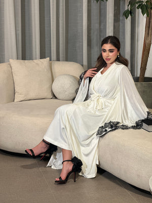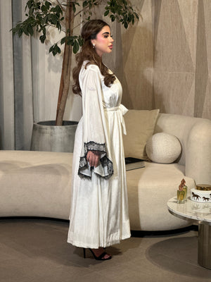 روب قطعتين الداخليه نفنوف حفر كريب الروب مخنل حربر لون اوف وايت مزين بالدانتيل الاسود